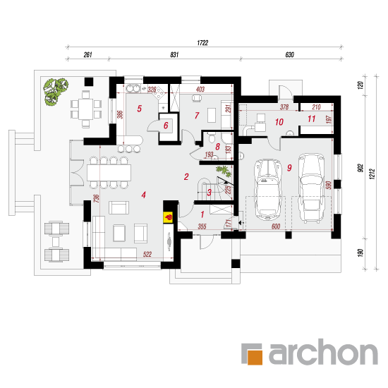 Wysokość:9.08 m Układ dachu:czterospadowy Kąt nachylenia dachu:42 o Ilość kondygnacji:2 Ilość pokoi:6 Ilość łazienek:3 Ilość kuchnii:1 Ilość stanowisk w garażu:2 Minimalna długość działki:20.12 m Minimalna szerokość działki:25.22 m