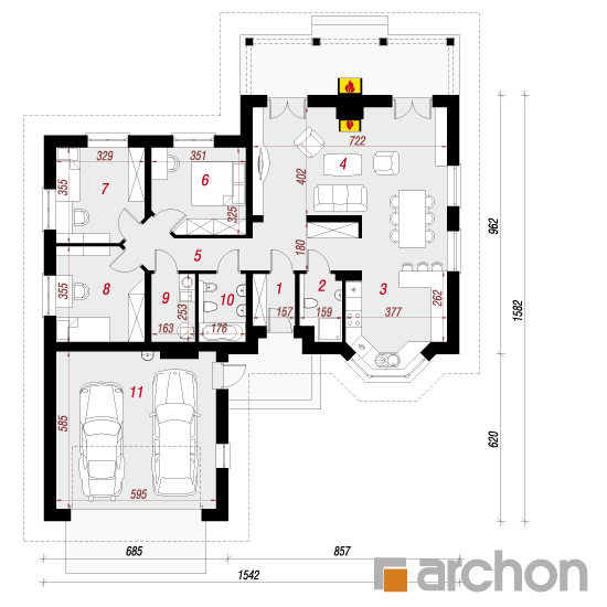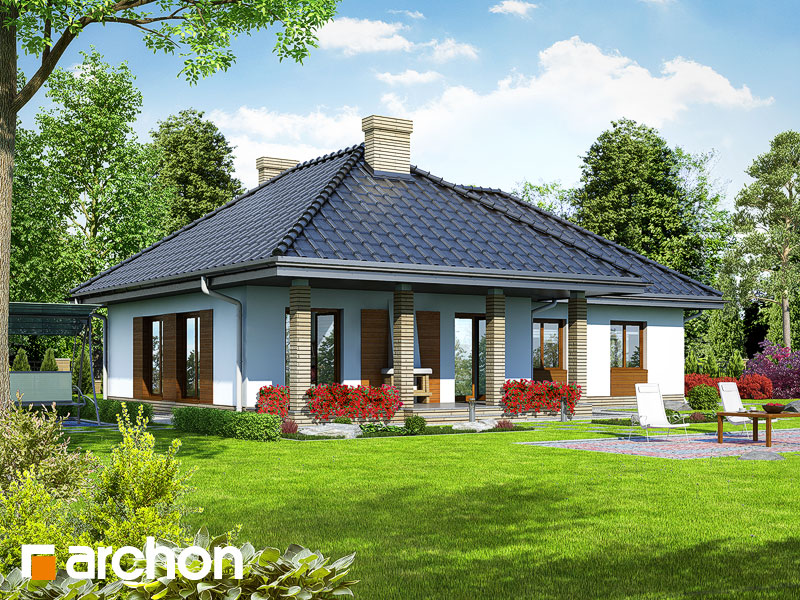 Wysokość:6.65 m Układ dachu:czterospadowy Kąt nachylenia dachu:35 o Ilość kondygnacji:1 Ilość pokoi:4 Ilość łazienek:2 Ilość kuchnii:1 Ilość stanowisk w garażu:2 Minimalna długość działki:24.36 m Minimalna szerokość działki:23.42 m