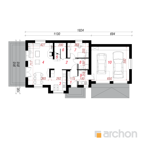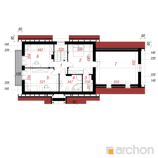 Wysokość:8.27 m Układ dachu:dwuspadowy Kąt nachylenia dachu:42 o Ilość kondygnacji:2 Ilość pokoi:5 Ilość łazienek:2 Ilość kuchnii:1 Ilość stanowisk w garażu:2 Minimalna długość działki:17.1 m Minimalna szerokość działki:26.24 m