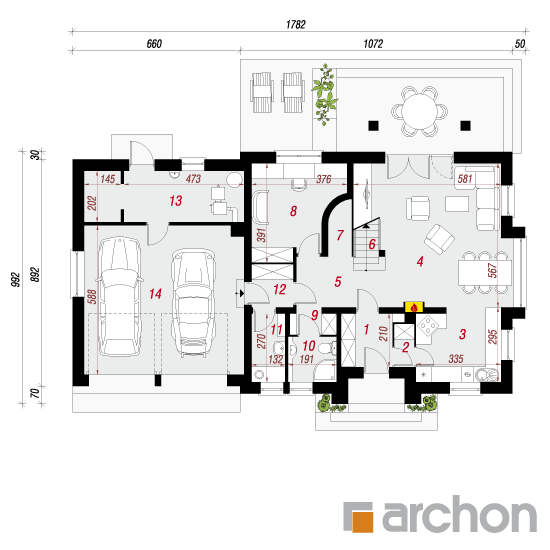 Wysokość:8.38 m Układ dachu:czterospadowy Kąt nachylenia dachu:38 o Ilość kondygnacji:2 Ilość pokoi:6 Ilość łazienek:2 Ilość kuchnii:1 Ilość stanowisk w garażu:2 Minimalna długość działki:17.92 m Minimalna szerokość działki:25.82 m