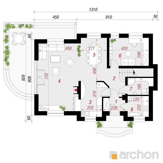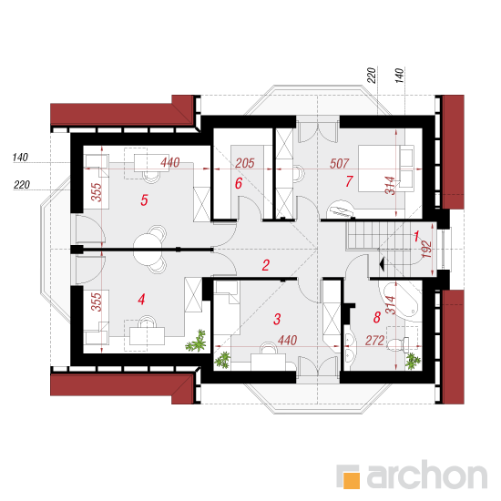 Wysokość:8.09 m Układ dachu:dwuspadowy Kąt nachylenia dachu:40 o Ilość kondygnacji:2 Ilość pokoi:6 Ilość łazienek:2 Ilość kuchnii:1 Ilość stanowisk w garażu:0 Minimalna długość działki:17.28 m Minimalna szerokość działki:21.1 m