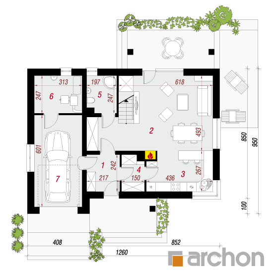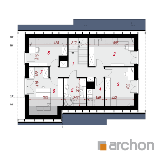 Wysokość:8.6 m Układ dachu:dwuspadowy Kąt nachylenia dachu:40 o Ilość kondygnacji:2 Ilość pokoi:5 Ilość łazienek:2 Ilość kuchnii:1 Ilość stanowisk w garażu:1 Minimalna długość działki:17.5 m Minimalna szerokość działki:20.6 m
