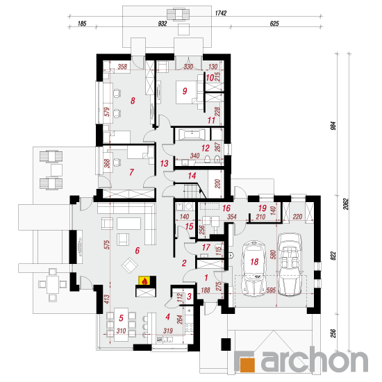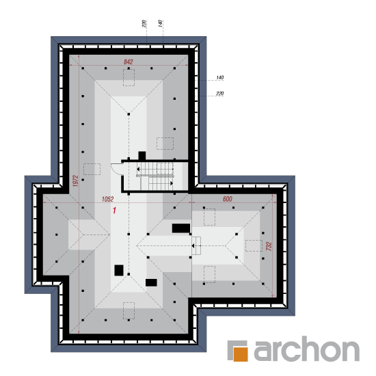 Wysokość:6.92 m Układ dachu:czterospadowy Kąt nachylenia dachu:35 o Ilość kondygnacji:2 Ilość pokoi:4 Ilość łazienek:1 Ilość kuchnii:1 Ilość stanowisk w garażu:2 Minimalna długość działki:28.62 m Minimalna szerokość działki:25.42 m