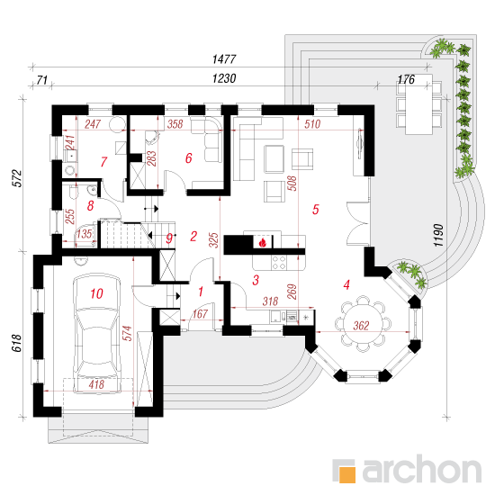 Wysokość:8.5 m Układ dachu:czterospadowy Kąt nachylenia dachu:42 o Ilość kondygnacji:2 Ilość pokoi:6 Ilość łazienek:3 Ilość kuchnii:1 Ilość stanowisk w garażu:1 Minimalna długość działki:19.9 m Minimalna szerokość działki:22.77 m