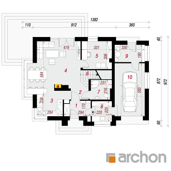 Wysokość:8.48 m Układ dachu:dwuspadowy Kąt nachylenia dachu:40 o Ilość kondygnacji:2 Ilość pokoi:6 Ilość łazienek:2 Ilość kuchnii:1 Ilość stanowisk w garażu:1 Minimalna długość działki:17.72 m Minimalna szerokość działki:21.82 m