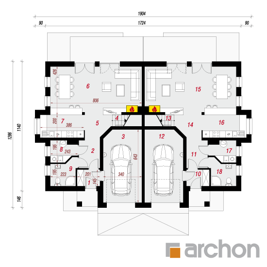 Wysokość:8.63 m Układ dachu:dwuspadowy Kąt nachylenia dachu:35 o Ilość kondygnacji:2 Ilość pokoi:10 Ilość łazienek:4 Ilość kuchnii:2 Ilość stanowisk w garażu:2 Minimalna długość działki:20.86 m Minimalna szerokość działki:27.04 m