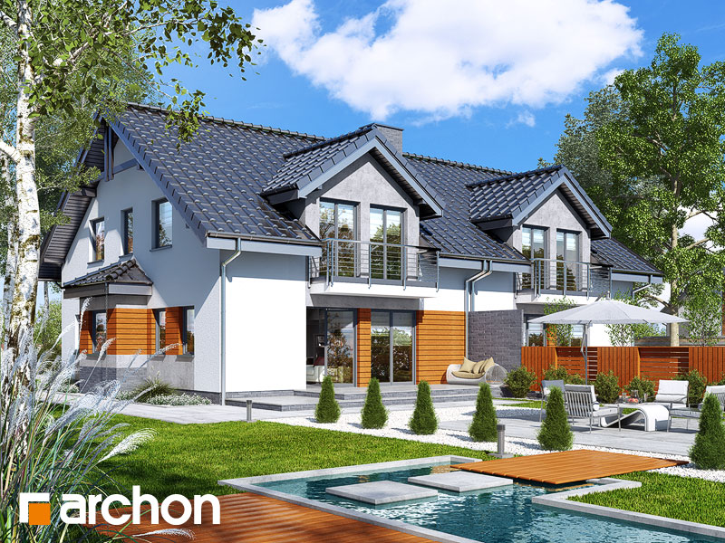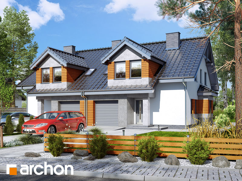 Typ domu:Dom dwurodzinny (jednorodzinny dwulokalowy) Dach:dwuspadowy, nachylenie 35 st (78%), więźba drewniana, dachówka ceramiczna Powierzchnia zabudowy / netto:220.31 / 259.68 m 2 Powierzchnia garażu:41.44 m 2 Kubatura:1454.7 m 2