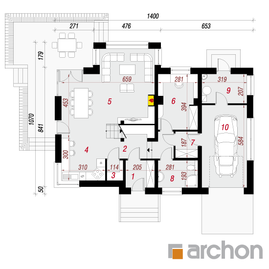 Wysokość:8.62 m Układ dachu:dwuspadowy Kąt nachylenia dachu:40 o Ilość kondygnacji:2 Ilość pokoi:5 Ilość łazienek:2 Ilość kuchnii:1 Ilość stanowisk w garażu:1 Minimalna długość działki:18.7 m Minimalna szerokość działki:22 m