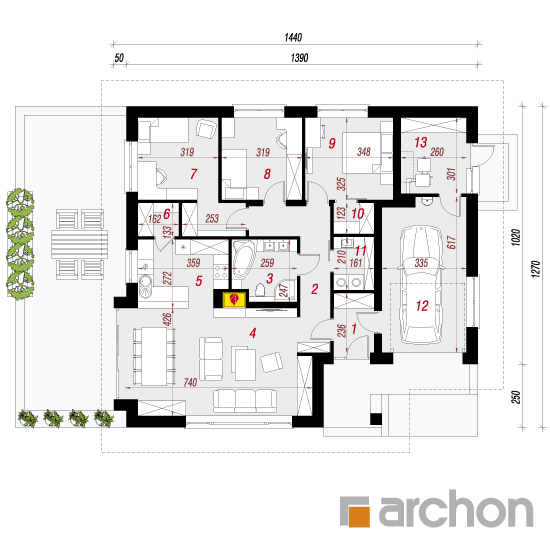 Wysokość:7.05 m Układ dachu:czterospadowy Kąt nachylenia dachu:30 o Ilość kondygnacji:1 Ilość pokoi:4 Ilość łazienek:1 Ilość kuchnii:1 Ilość stanowisk w garażu:1 Minimalna długość działki:20.7 m Minimalna szerokość działki:22.4 m