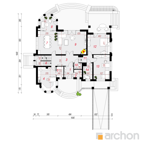 Wysokość:10.11 m Układ dachu:czterospadowy Kąt nachylenia dachu:42 o Ilość kondygnacji:2 Ilość pokoi:8 Ilość łazienek:3 Ilość kuchnii:1 Ilość stanowisk w garażu:0 Minimalna długość działki:28.1 m Minimalna szerokość działki:24.27 m