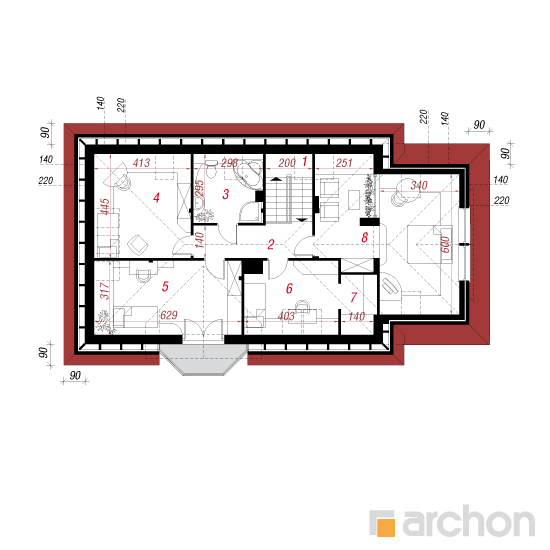 Wysokość:8.34 m Układ dachu:czterospadowy Kąt nachylenia dachu:42 o Ilość kondygnacji:2 Ilość pokoi:6 Ilość łazienek:2 Ilość kuchnii:1 Ilość stanowisk w garażu:1 Minimalna długość działki:17.8 m Minimalna szerokość działki:24.35 m