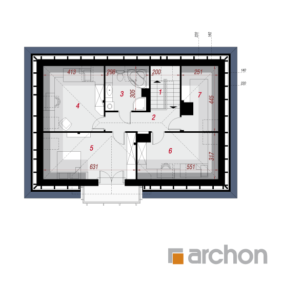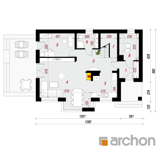 Wysokość:8.49 m Układ dachu:czterospadowy Kąt nachylenia dachu:42 o Ilość kondygnacji:2 Ilość pokoi:5 Ilość łazienek:2 Ilość kuchnii:1 Ilość stanowisk w garażu:0 Minimalna długość działki:17.82 m Minimalna szerokość działki:20.62 m
