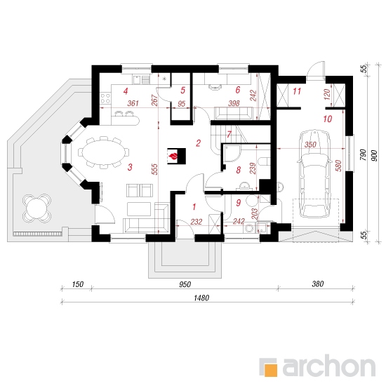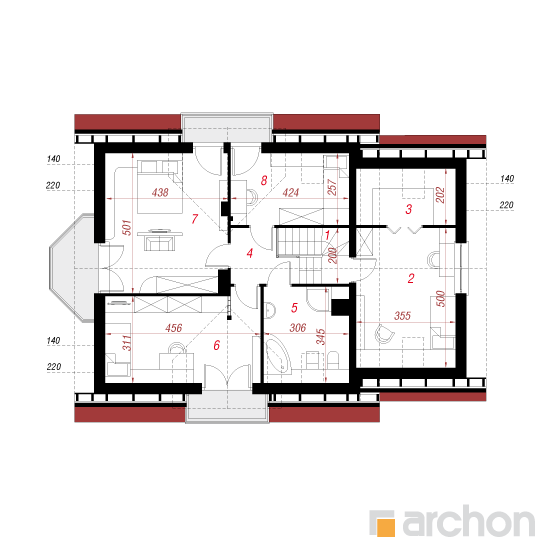 Wysokość:8.32 m Układ dachu:dwuspadowy Kąt nachylenia dachu:40 o Ilość kondygnacji:2 Ilość pokoi:6 Ilość łazienek:2 Ilość kuchnii:1 Ilość stanowisk w garażu:1 Minimalna długość działki:17 m Minimalna szerokość działki:22.8 m