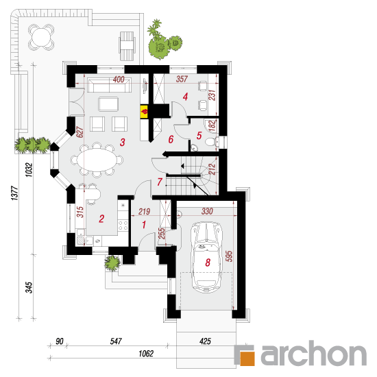 Wysokość:8.33 m Układ dachu:czterospadowy Kąt nachylenia dachu:40 o Ilość kondygnacji:2 Ilość pokoi:5 Ilość łazienek:2 Ilość kuchnii:1 Ilość stanowisk w garażu:1 Minimalna długość działki:21.77 m Minimalna szerokość działki:17.62 m
