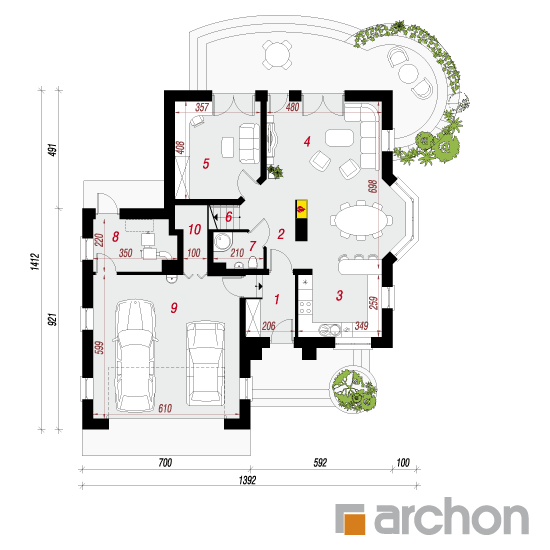 Wysokość:8.49 m Układ dachu:czterospadowy Kąt nachylenia dachu:38 o Ilość kondygnacji:2 Ilość pokoi:5 Ilość łazienek:2 Ilość kuchnii:1 Ilość stanowisk w garażu:2 Minimalna długość działki:22.12 m Minimalna szerokość działki:21.92 m