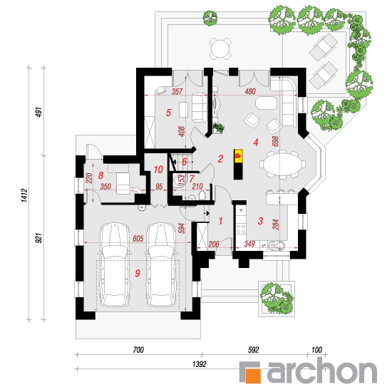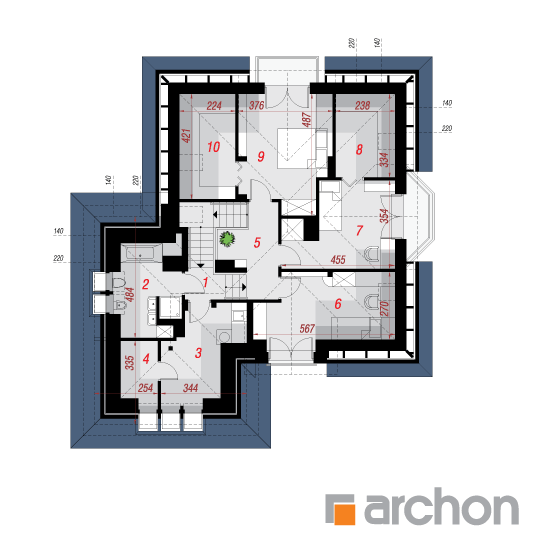 Wysokość:8.49 m Układ dachu:czterospadowy Kąt nachylenia dachu:38 o Ilość kondygnacji:2 Ilość pokoi:5 Ilość łazienek:2 Ilość kuchnii:1 Ilość stanowisk w garażu:2 Minimalna długość działki:22.12 m Minimalna szerokość działki:21.92 m