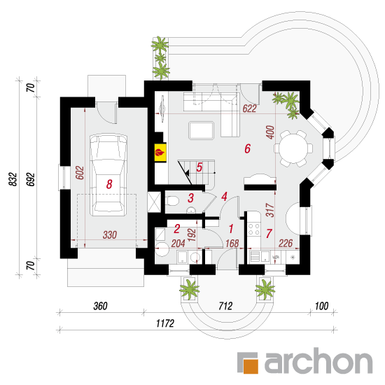 Wysokość:8.35 m Układ dachu:dwuspadowy Kąt nachylenia dachu:42 o Ilość kondygnacji:2 Ilość pokoi:4 Ilość łazienek:2 Ilość kuchnii:1 Ilość stanowisk w garażu:1 Minimalna długość działki:16.32 m Minimalna szerokość działki:19.72 m