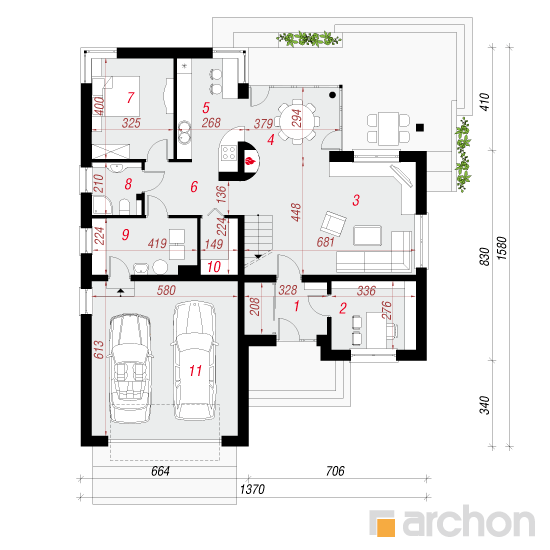 Wysokość:8.54 m Układ dachu:dwuspadowy Kąt nachylenia dachu:38 o Ilość kondygnacji:2 Ilość pokoi:6 Ilość łazienek:2 Ilość kuchnii:1 Ilość stanowisk w garażu:2 Minimalna długość działki:23.8 m Minimalna szerokość działki:21.7 m
